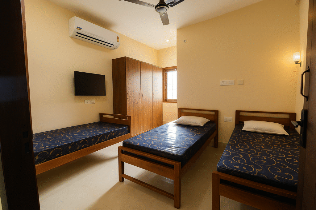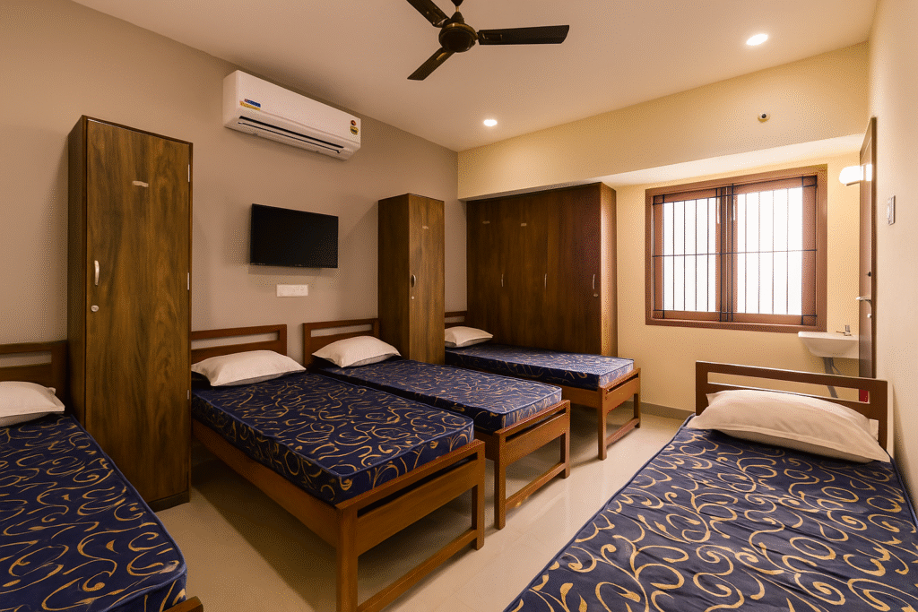 Our 3-sharing rooms offer the perfect balance of privacy and community living. Each resident enjoys a comfortable bed, personal wardrobe, and designated study area with a desk and chair. The room is spacious, well-ventilated, and furnished with modern amenities to ensure a pleasant stay